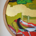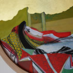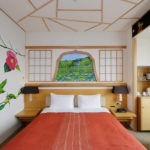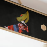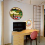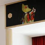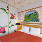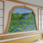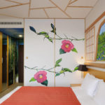 Akita is a prefecture situated in the north of Japan. Ms. Ohtani says “Since I started living in the Akita region, coming in contact with the scenery, history and lifestyle of the people there, I became more strongly aware of my own identity as a Japanese person”. The work she created is a room decorated all over with Akita cedarwood, and is a fusion of Japanese and Western styles. Past the cedarwood forest painting at the room entrance, right in front, there’s a cedarwood window frame, and through it, a moat with glorious lotus flowers in bloom. On the left wall, in the guise of a sliding screen, there are camellia japonica flowers, while the ceiling has a “cracked ice” pattern, often used for pottery or designing Japanese-style rooms, but here fashioned in cedarwood. In the guise of the upper closet, there’s a painted window frame, and through it, “Nishimonai Bon-Odori” summer festival dancers, while in the closet are painted pole lanterns of the “Akita Kanto Festival”. This room offers guests a myriad of images testifying to the beauty of the Akita region of Japan.