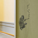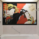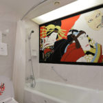 Created using graceful, flowing circles and curves, the drawing of the horse on the wall gives a vibrant and dynamic feel to the room. The artist has used a bold composition consisting of only arms and legs to express the movement of Kabuki. Its sense of presence is effectively conveyed through the circles drawn to conceal reality. The bright red color stands out from the soft-colored wall. In contrast, drawn lightly on the opposite side of the bed are plums used as Kabuki props. When you open the closet, you will be greeted by sullen-faced Joruri whose singing voices seem almost audible even today. In addition, another highlight of this room is its bathroom. Soaking in the bath while enjoying the impressive painting is definitely a first-class experience.