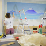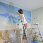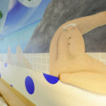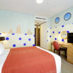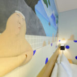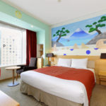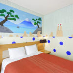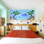 On the headboard, a painting of Mount Fuji and pine trees. On the wall, the mosaic looks like tiles, but this is also a picture. This painting, which makes you feel like you’re actually inside a “sento” (Japanese bathhouse), surrounds you. Migita chose the theme of “sento” as her motif because it’s part of the “austere, daily life of the Japanese people”. She wanted to create a room where you could relax body and mind in the easy-going atmosphere of a Japanese bathhouse. And the characters painted there are the fictitious people called PONI (dwellers) which always appear in her work. The painting shows these dwellers, who might be foreign guests or space travelers, enjoying Japanese culture.