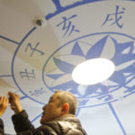 部屋の天井に記した方位マークは、江戸期の地図から引用したものです。これはそのまま、この部屋の方角を表しています。今回、僕は「江戸‐東京」のテーマのもと、この部屋に東京の3つのランドマークを描きました。スカイツリー、東京タワー、日本橋。ランドマークはこの部屋からみて、それぞれ描かれた壁の向く方角にあるものです。
