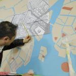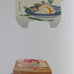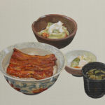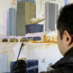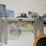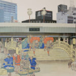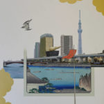 絵の近景には浮世絵から図像を引用しました。江戸後期に活躍した錦絵の巨匠、広重の描いた名所絵から、同じ場所、同じアングルより描いたものを選んで重ねてみました。江戸と東京。160年を隔てたふたつの景色はまったく別の場所のようで驚かされます。