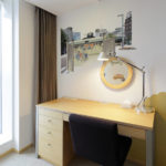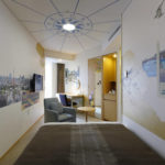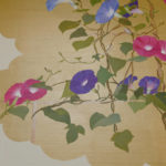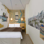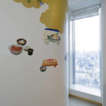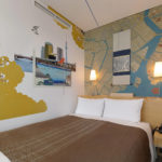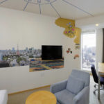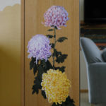 「この部屋に滞在することで、現代的な景色の背後に流れるこの街の歴史を、少しでも意識する切っ掛けとなってもらえたら」という、ふるかはさん。制作したのは、2016年の東京の景色と重なるように、江戸の風景が描かれたお部屋です。スカイツリー、東京タワー、日本橋といった東京のランドマークを遠景に、近景には歌川広重が描いた浮世絵から引用して、同じ場所の名所絵が重ねて描かれました。変わり行く街並みと、季節が巡っても変わらずに咲く花。部屋の随所に描かれた桜、紫陽花、朝顔、菊、山茶花がお部屋を彩ります。