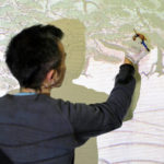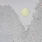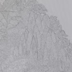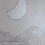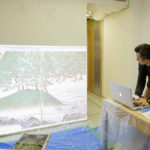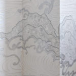 中国に始まる東洋画の一部門である山水画は、普遍的な自然の姿を描いたものです。今回、山水をテーマにこの部屋に描いたのは、大阪の金剛寺にある《日月山水図屏風》をモチーフとしたものです。《日月山水図屏風》は、日本固有のやまと絵形式で描かれた風景画ですが、特定の場所を描いたものではなく、画家の胸中に浮かぶ日本の風景——神々の宿りとしての山や森、滝、海原を、昼と夜、四季とともに一双の屏風に収めたものです。折り目のある屏風は、縁側の横から入る自然の光や、夜の蝋燭の光に照らされ、自然と一体になって豊かな表情を見せたことでしょう。このことを手がかりに、窓の外の豊かな風景と一体となって呼応する様な作品をめざし、全体と細部の表情の違いや、時間による見え方の変化にこだわって描きました。