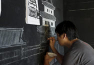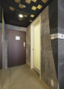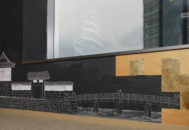 Mizuguchi says: “I wanted to paint a different world that transcends time in a special space”. Before starting the work, he visited castles all over Japan. Initially, he planned to represent roof tiles shining in a blue sky with verdigris, but while he was working during his stay at the hotel, his vision began to change, and he wanted to re-do it differently. Discussions between the hotel team and the artist ensued. He painted over what had been the walls up to July, and then painted Edo Castle, which had been lost in the fire, in white lines on a black background.
