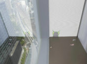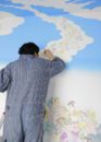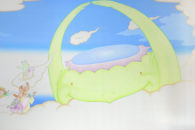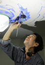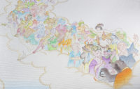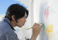 The work, which began on 16th March, was completed on 4th August. For “Supernatural beings and the sky”, Magome chose Room 3125, which offers the best view of the sky from the bed. When you enter the room, you are greeted by a big “kappa” (River Being) smiling at you sweetly. The supernatural beings, full of fun, form a line right up to the sky. Clouds, in the shape of 4 gods – the Azure Dragon of the East, Vermilion Bird of the South, the White Tiger of the West, and the Black Turtle of the North – swirl around the “sky” or ceiling light. They watch over the room. And the supernatural beings from the sky slip from the round mirror into the room again, go around the window frame, pass through the kappa’s arch, and return to the sky. The artist painted each supernatural being very finely, so the whole work took more than 4 months to complete.