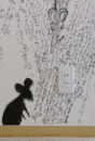 Yasumoto prepared some gimmicks for the room guests by making the most of the three-dimensional canvas. Visitors lying on the bed can make eye contact with the tiger painted on the back wall through a mirror and a monkey is hiding behind the curtain.